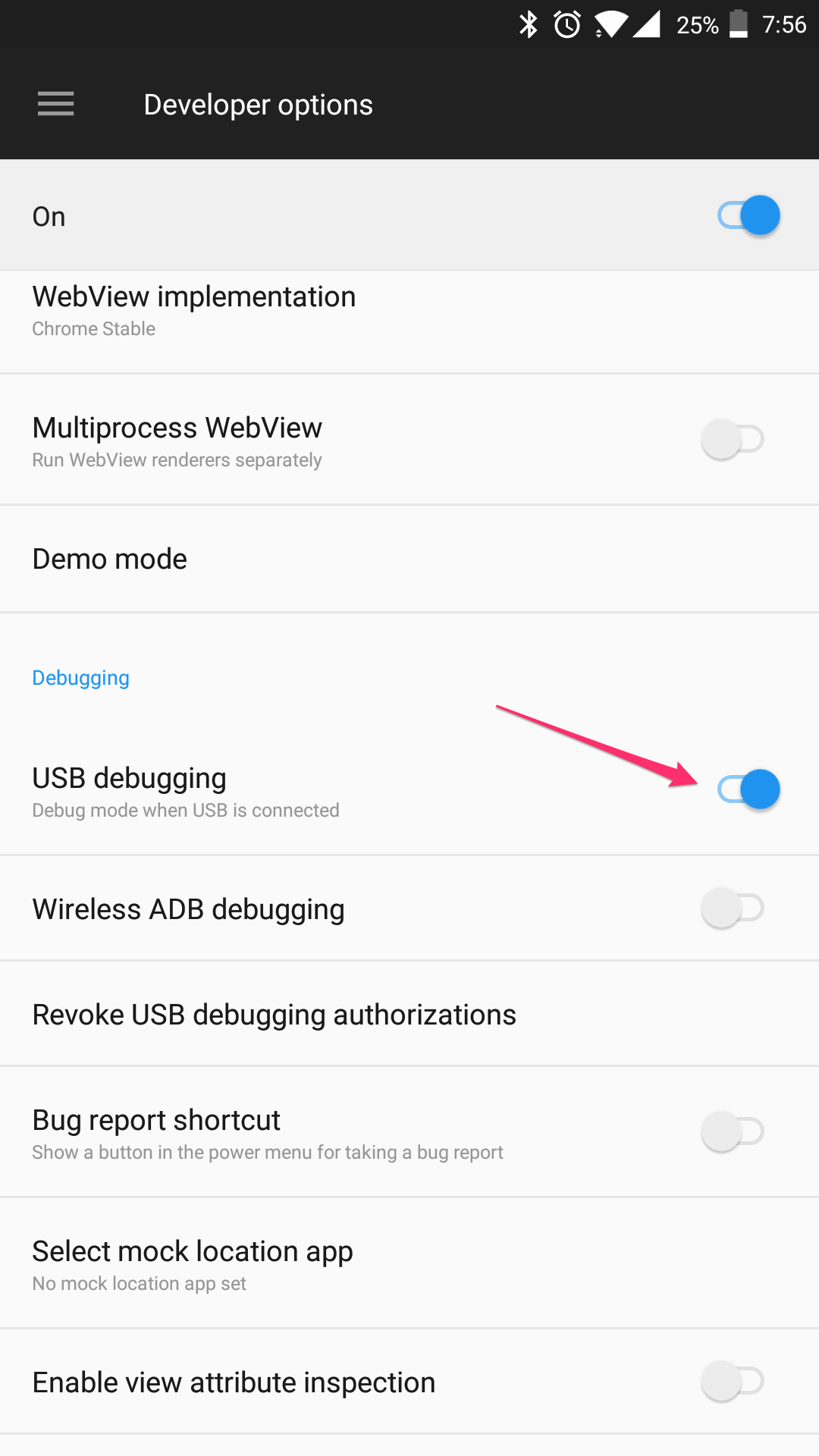 - Connect your mobile device to your computer. On your mobile device, go to Settings > Developer options and enable USB Debugging.