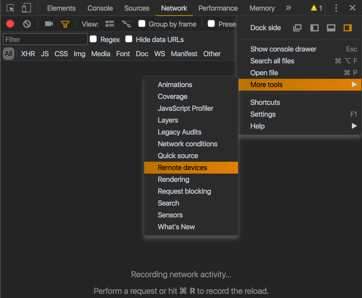 - On your computer, fire up Chrome, and then the developer tools (Cmd/Ctrl + Opt/Alt + i). On the row with the different tabs, click on the three dots on the right to load more options. There, under More Tools, you should find an option called Remote Devices.