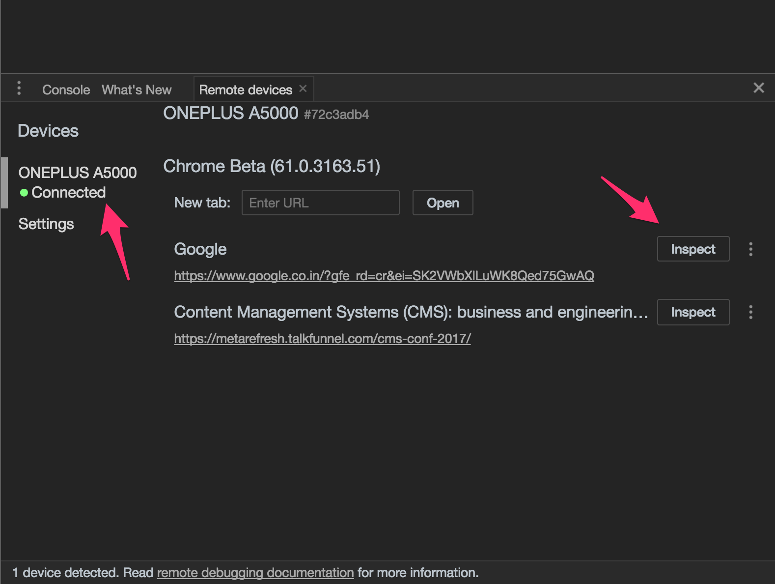 - Click on your device name in the chrome developer tools on your computer. It should list the different tabs that you’ve got open on your mobile device. Click on the Inspect button for the tab you want to debug.